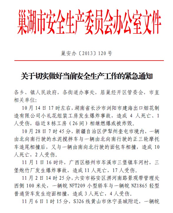 現(xiàn)將市安委辦《關(guān)于切實(shí)做好當(dāng)前安全生產(chǎn)工作的緊急通知》(巢安辦[2013]120號(hào))轉(zhuǎn)發(fā)給你們,請(qǐng)結(jié)合本行業(yè)安全生產(chǎn)管理特點(diǎn),認(rèn)真貫徹執(zhí)行。