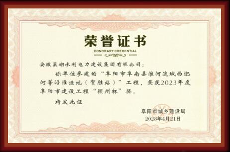 阜陽市阜南縣淮河流域西肥河等沿淮洼地(賀勝站)工程榮獲“穎州杯”獎