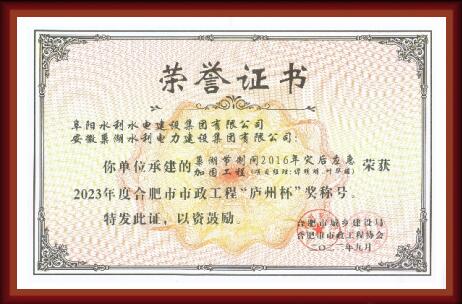 巢湖節制閘2016年災后應急加固工程榮獲“廬州杯”獎稱號