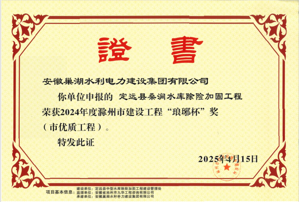 定遠桑澗水庫除險加固工程榮獲“瑯琊杯”